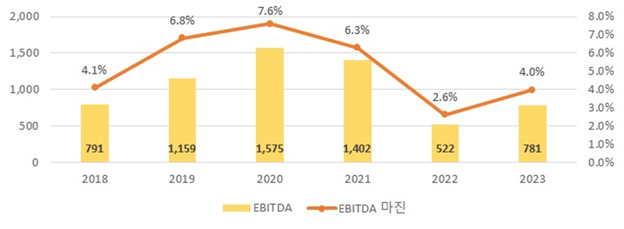 EBITDA 실적을 보면, 2020년 1,575억원을 달성하고, 2021년에는 1,400억원으로 감소했습니다. 투자 의사결정 시점이 2021년 8월쯤인데, 이때 2020년 6월까지의 실적이 EBITDA 724억원, 2021년 6월까지의 실적이 EBITDA 867억원이었으니 아마 2021년이 더 실적이 좋았을 것으로 예상했을 겁니다. 하지만, 2021년에 11% 감소했고, 2022년 2023년에는 800억원도 내지 못했네요.