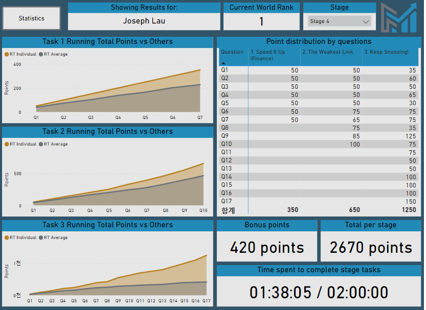 2020년 첫대회의 우승자는 호주의 Joseph Lau로 Commonwealth Bank of Australia에 다니고 있네요. 총점 5535점인데 그때는 지금과 방식이 달라 4번의 Stage만 있었던 것으로 보입니다. 우승자의 Stat을 조금 더 자세히 봐보시죠. Stage별 성적을 볼 수 있는데, Stage 4에서는 2시간 중 1시간 38분을 쓴 것으로 나타나네요.