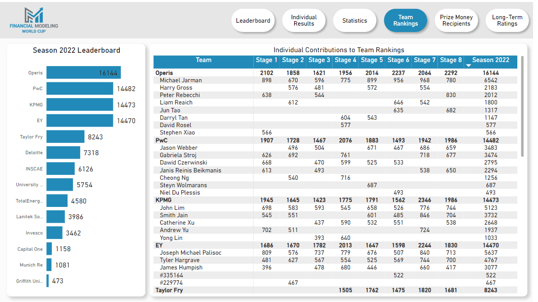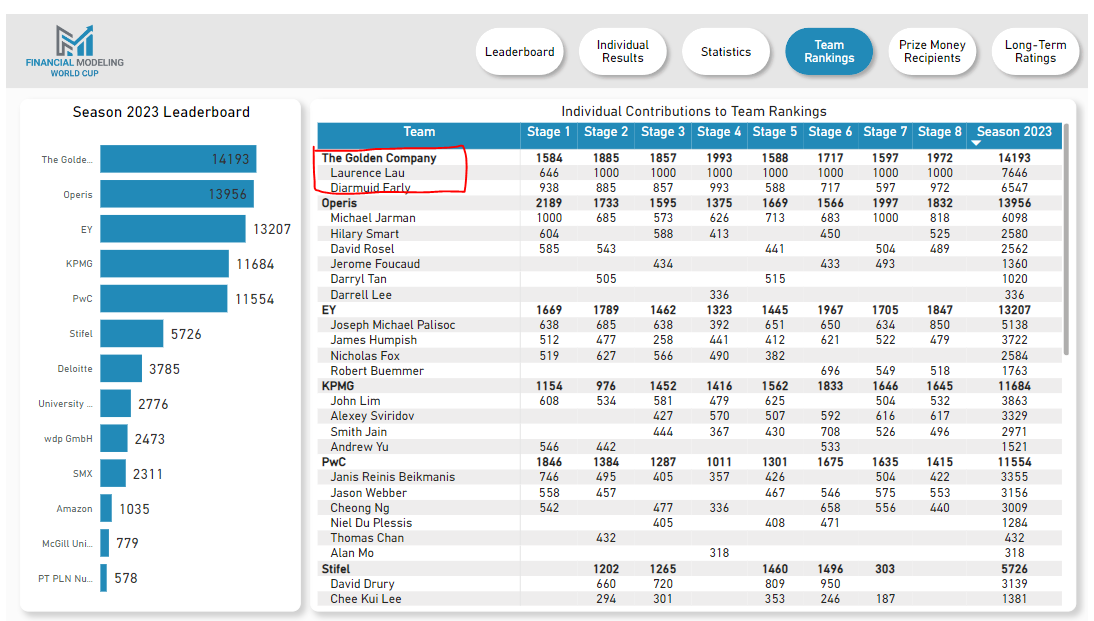 사실 앉아서 게임을 하는 것도 스포츠(E- Sports)라고 분류한다면, 재무모델링도 스포츠에 포함되지 말라는 법도 없습니다. 똑같이 컴퓨터 앞에 앉아서 누가 빠르고 정확하게 재무모델을 만드는지 대결하면, 그게 스타크래프트랑 크게 다르지 않을 것 같습니다. 물론 문제는 "그걸 누가 보고 앉아있냐"겠지만, 최종라운드에서는 방송으로 중계도 합니다. 그리고 스포츠라하면 랭킹이 있기 마련이죠. 이 대회도 순위가 있는데 이름, 국가, 문제별 점수, 소요시간까지 공식적으로 공개가 됩니다.