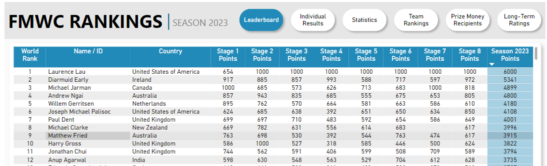 작년에 이어 네번째 대회인 2023년에도 Laurence Lau라는 미국인이 1위를 Diarmuid Early라는 ID를 쓰는 아일랜드인이 2위를 차지했습니다. 아무 이유없지만 제가 한번 트래킹해봤던 Anup Agarwal 인도는 이번대회는 12위를 했네요. 한국인은 여전히 보이지 않습니다. 아시아태평양에서는 호주, 인도, 필리핀, 뉴질랜드 정도의 국가가 주로 보이네요.